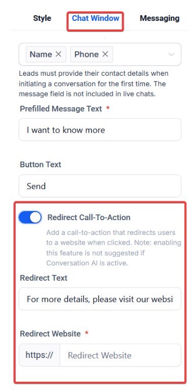 Add a custom message and link that appears after the contact form. Not recommended for use with Conversation AI.