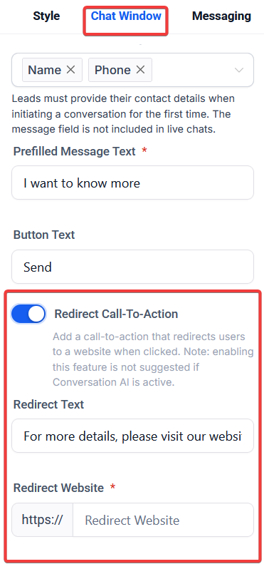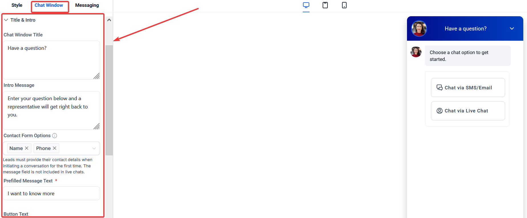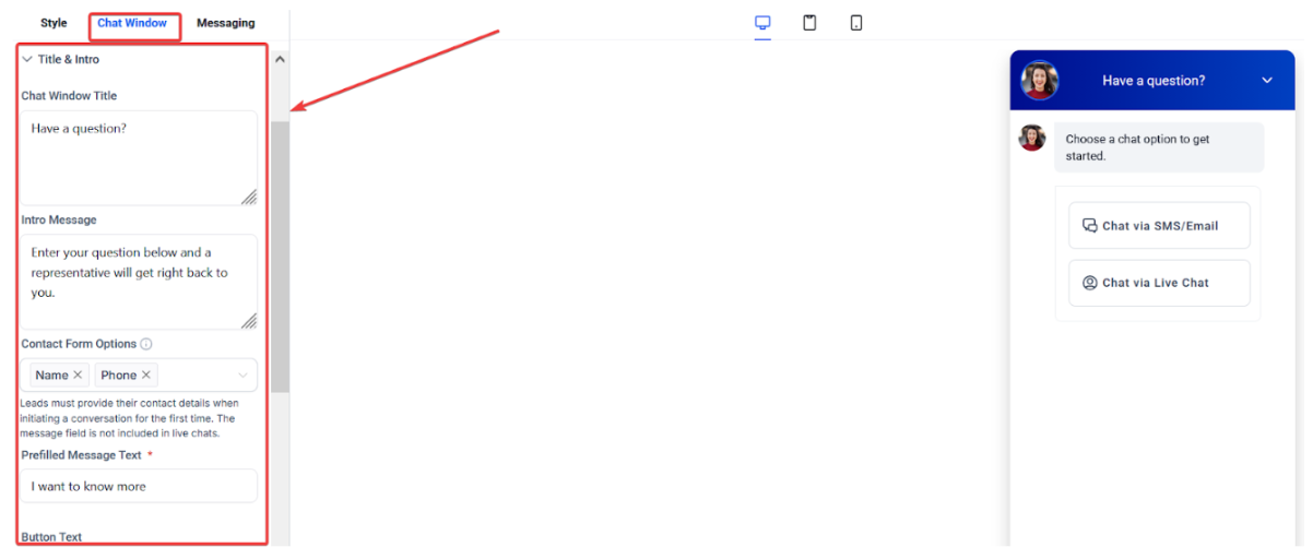 - Contact Form Fields: Standard fields like "Message" will be available for Email and WhatsApp chat to collect user information.