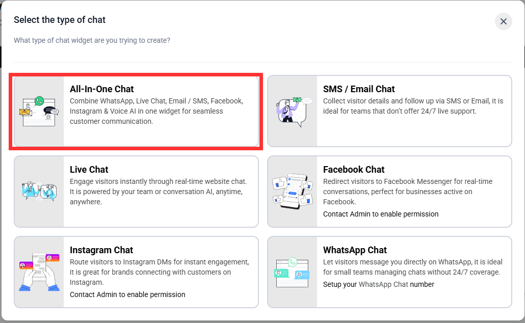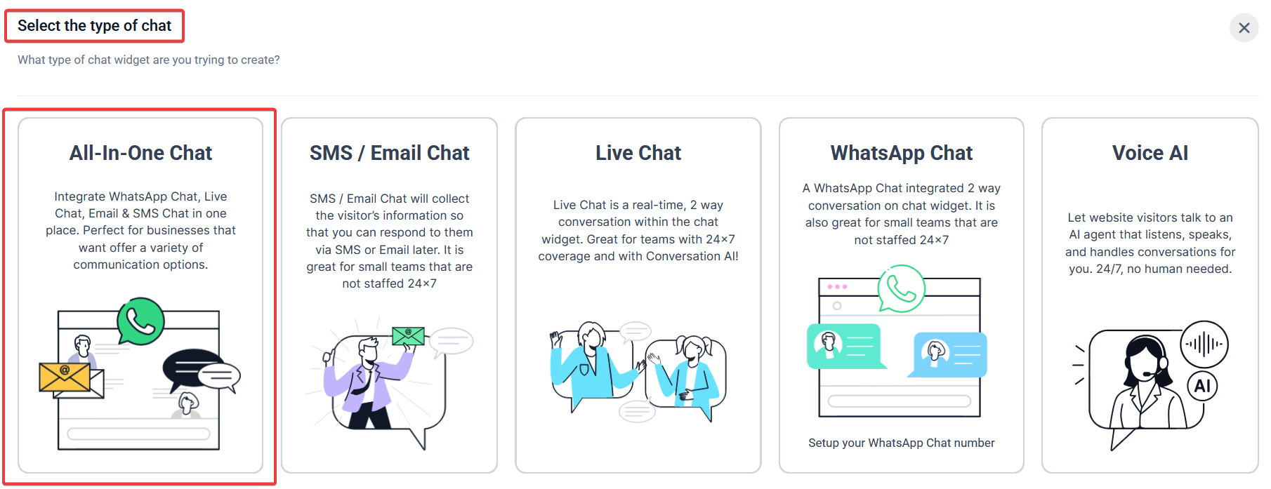 Click on "Create New Widget" and select All-in-One Chat from the list of chat types.