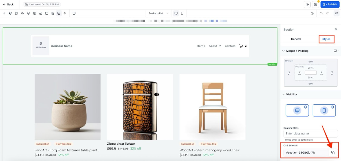 3- Copy the CSS Selector ID: Locate the CSS Selector field and copy the text (e.g., #section-FV_N4o-g-I) by clicking the copy button.