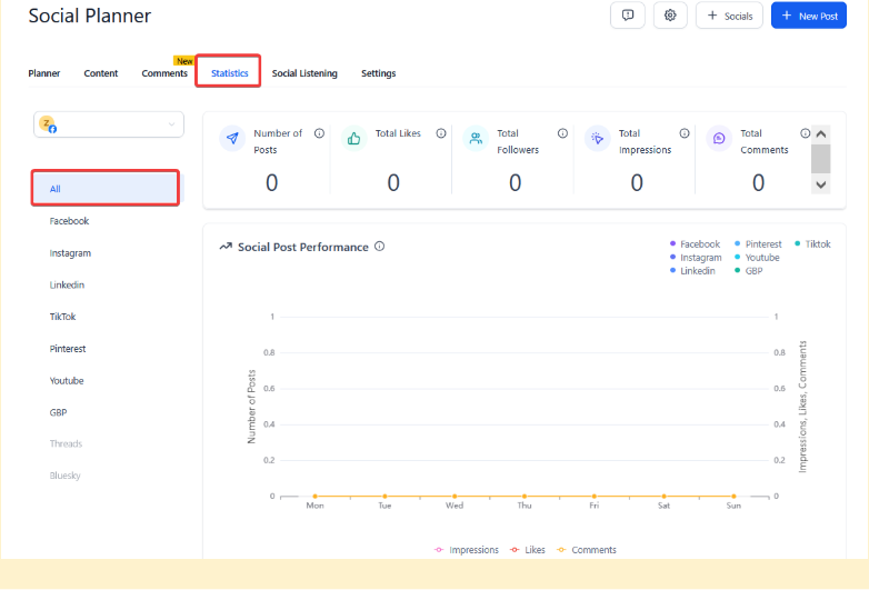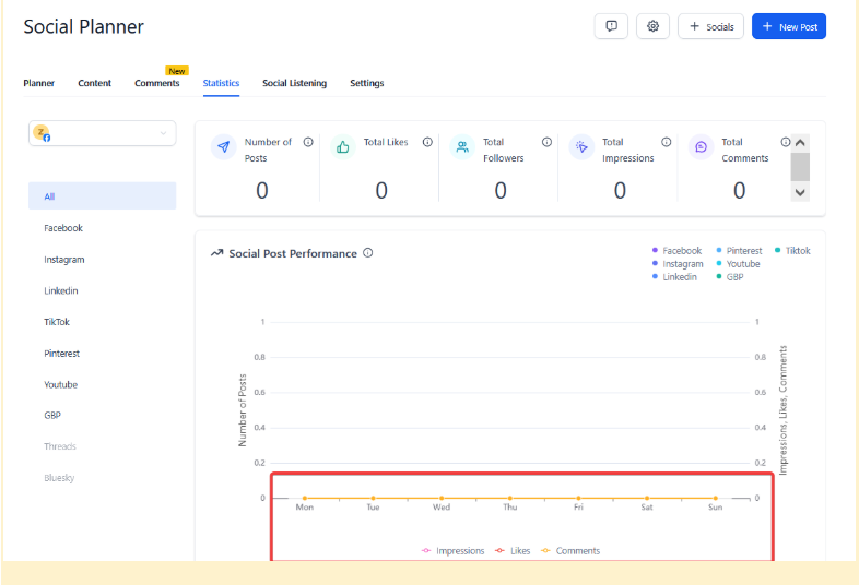 While there isn’t a date range filter in the Social Planner section, you can still monitor performance over time by using the built-in weekly and monthly comparisons available in the analytics. This allows you to understand trends and measure progress across different periods.