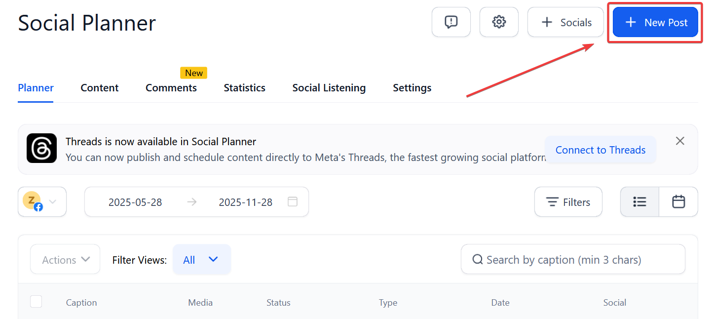 Navigate to the Marketing & Sales > Email & Social Media tab on the left > Social Planner on the top right > Create a new post or edit an existing post: