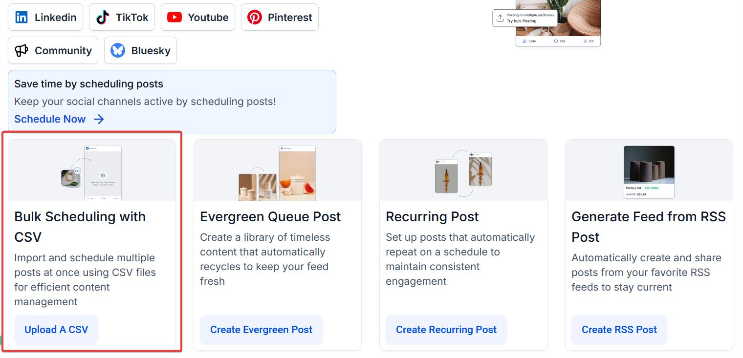 Bulk Scheduling in the Social Planner allows you to prepare, organize, and set up posts for your social media channels ahead of time. You can create content calendars using CSV/XLSX files with post details and upload them into the Social Planner. The Social Planner will make each post based on the information given. Bulk Scheduling posts using CSV/XLSX files will simplify the effort needed to build your social media presence.