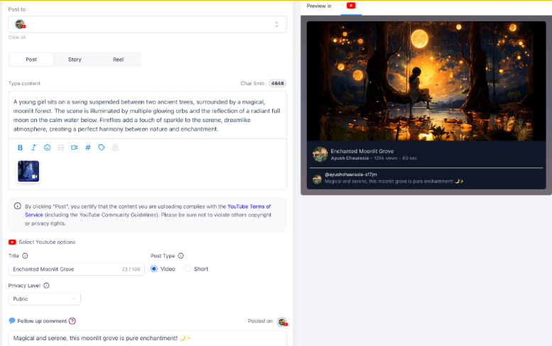 Yes, It allows users to create posts with both images and videos in one go, schedule them across platforms like YouTube, Instagram, and TikTok, preview posts in high resolution, manage errors with color-coded alerts, use custom values for personalized content, and adjust the text input area for easier content management.
