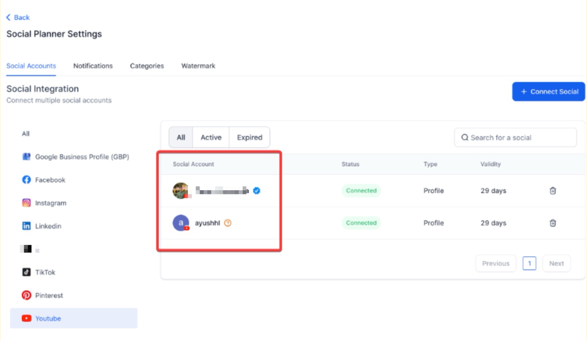 After selecting your account, confirm the connection. You should now see your YouTube account listed within the social planner.