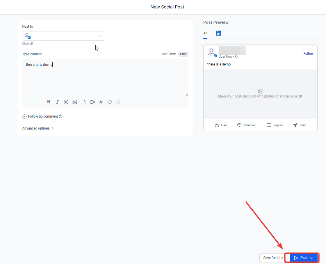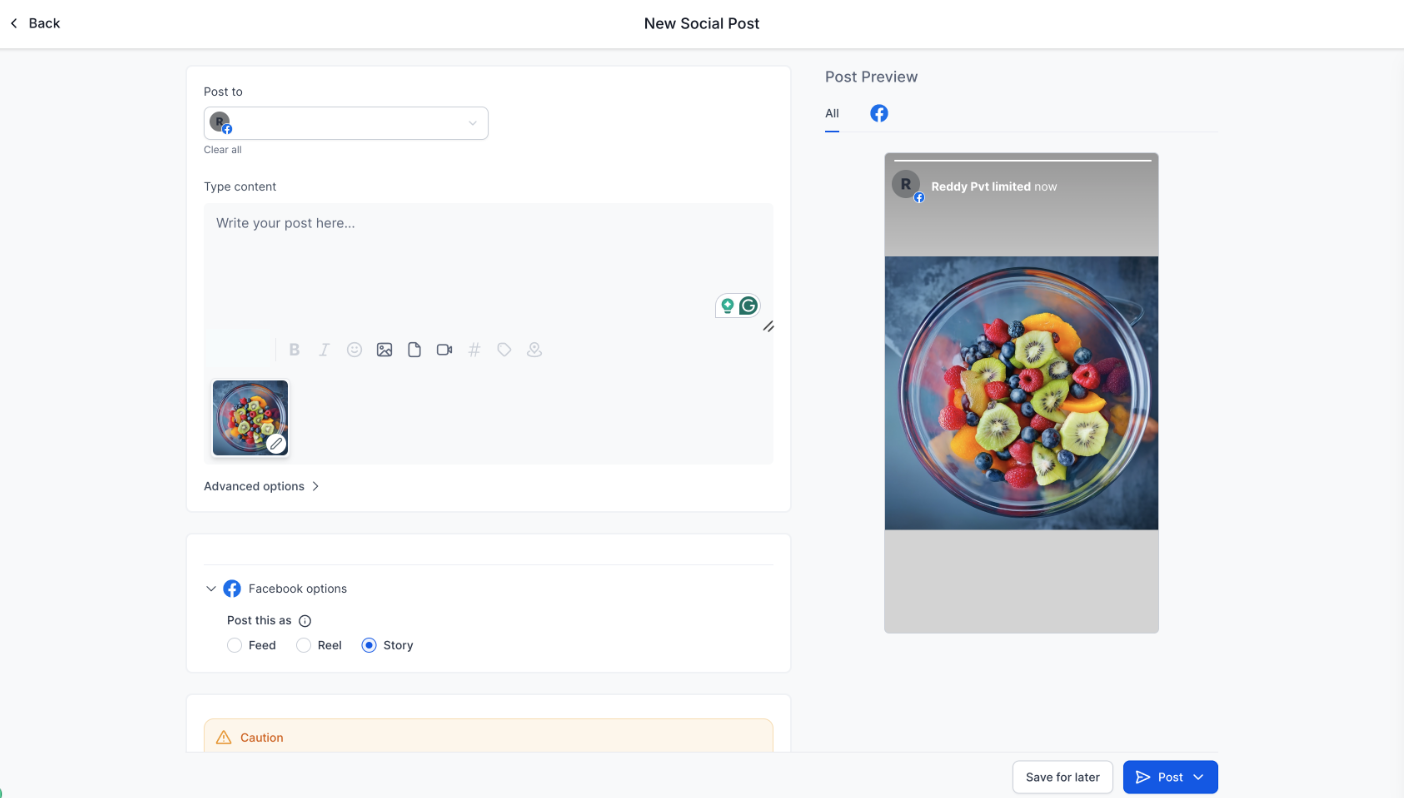 - Choose the social accounts (add Facebook pages) from the dropdown and enter your post content.