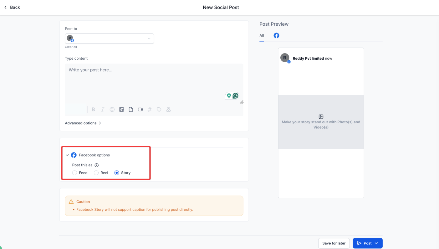 - Currently, this feature is only available for Facebook pages. Posts for groups will appear as regular posts in the group feed.