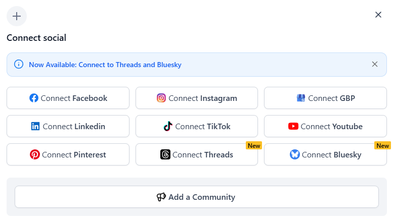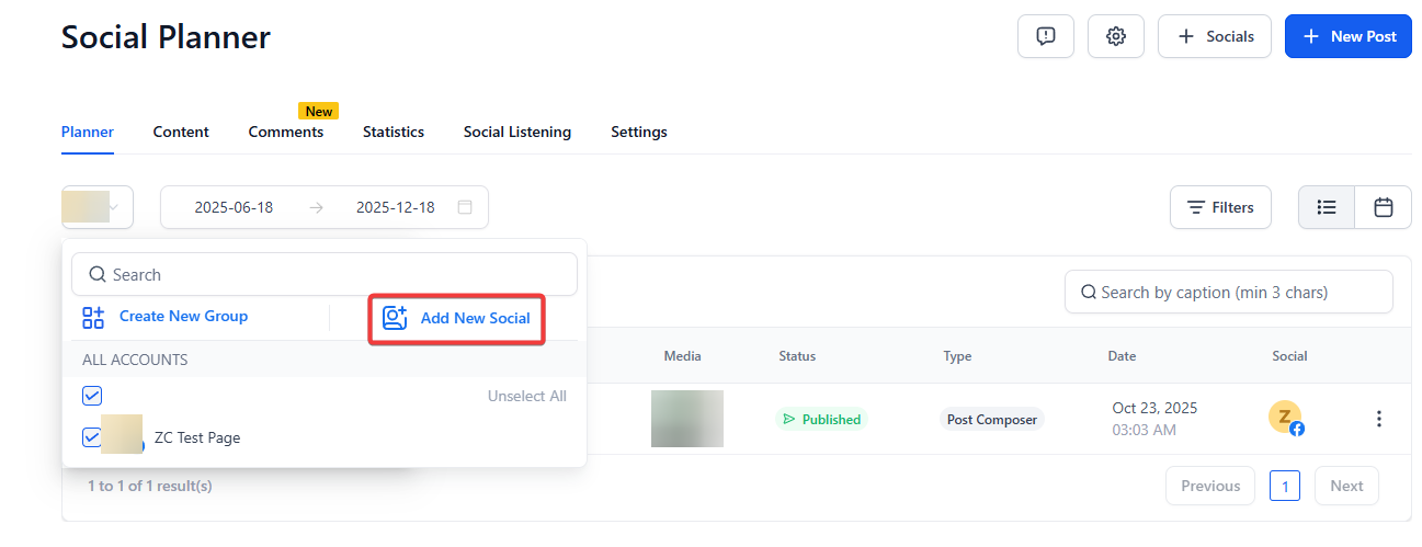 - Go to Marketing > Social Planner and connect your Facebook page(s).