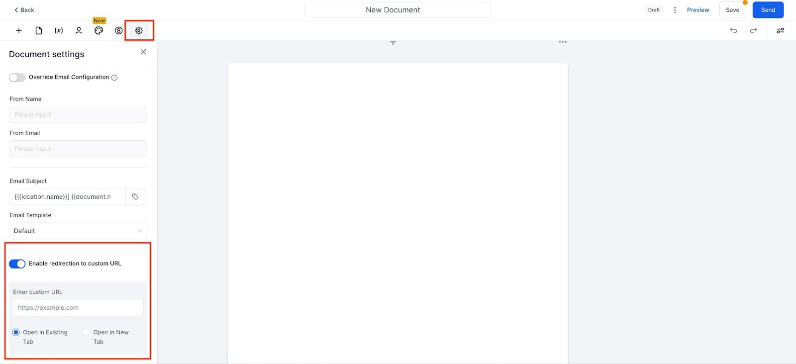 Select "Document Settings" from the sidebar and toggle on the option to "Redirect to a Custom URL."