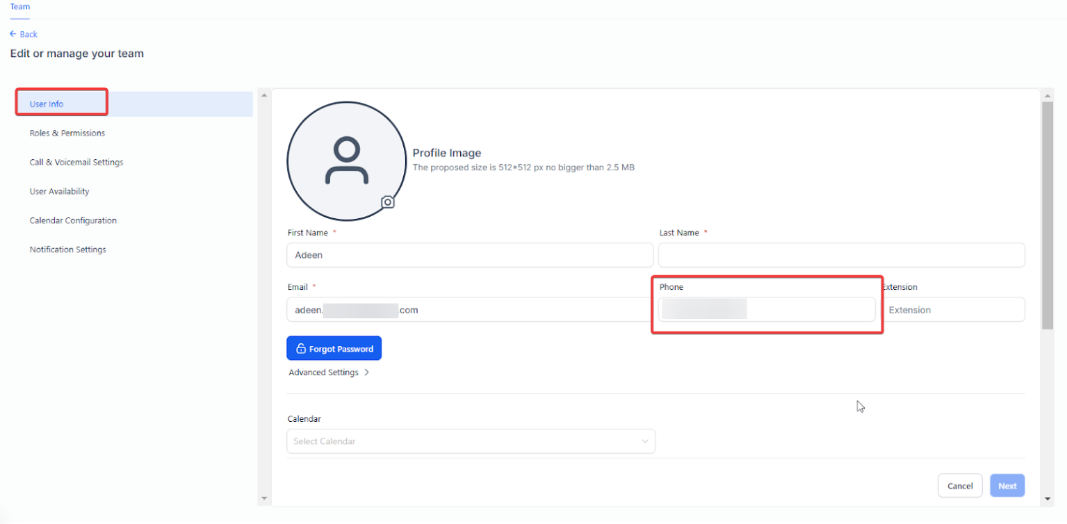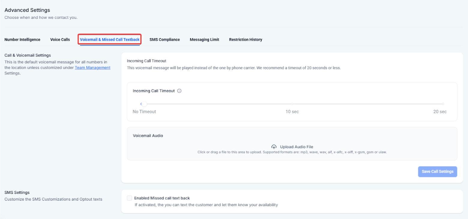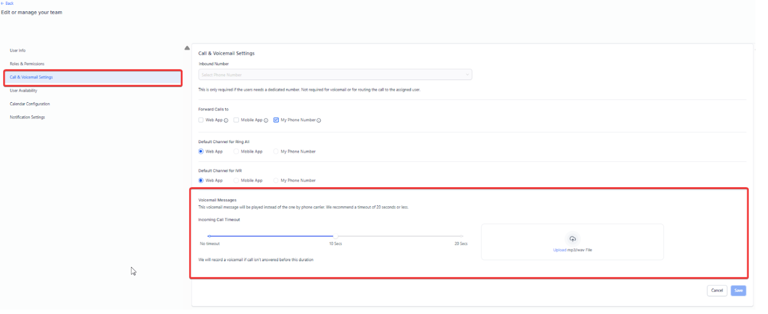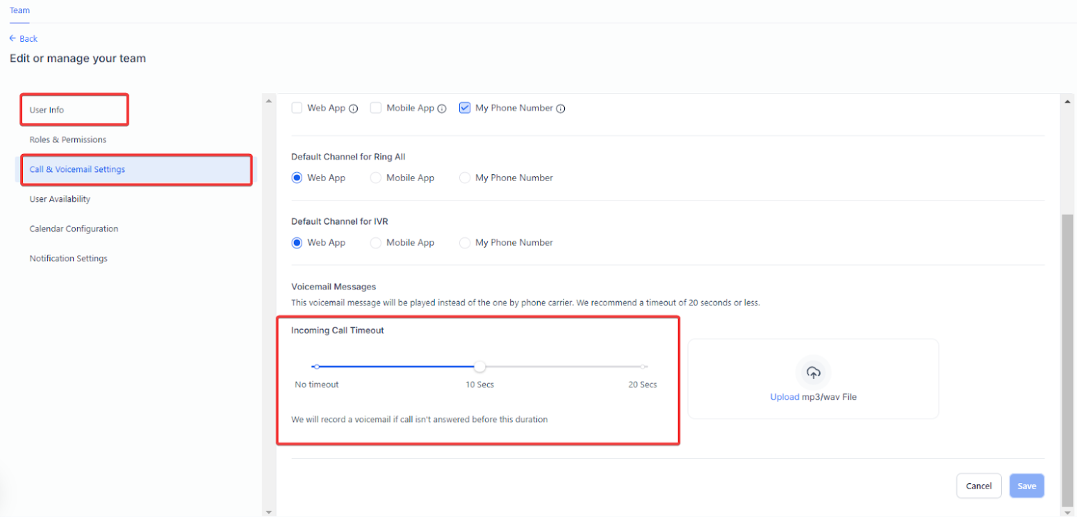 We recommend setting the incoming call timeout to 1 second. If it’s set to a longer duration (e.g., 15 or 20 seconds), the voicemail associated with the phone number (within the User Info tab) to which the call is forwarded will play instead of the one in Call & Voicemail Settings. To fix this, set the timeout to 1 second, save the changes, and test it. You can increase the seconds and test it out to see at exactly what second the system switched to the voicemail of the number in the User Info Tab