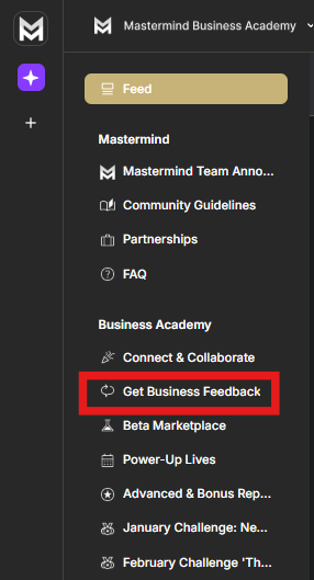 Once within the Community you can navigate to the Get Business Feedback tab on the navigation menu on the left side of the MBA Community: