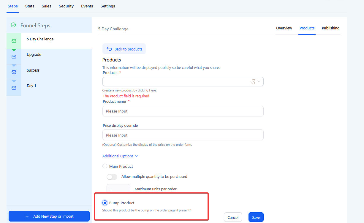 - For any additional products, select the Order Bump checkbox when adding the product to your funnel.