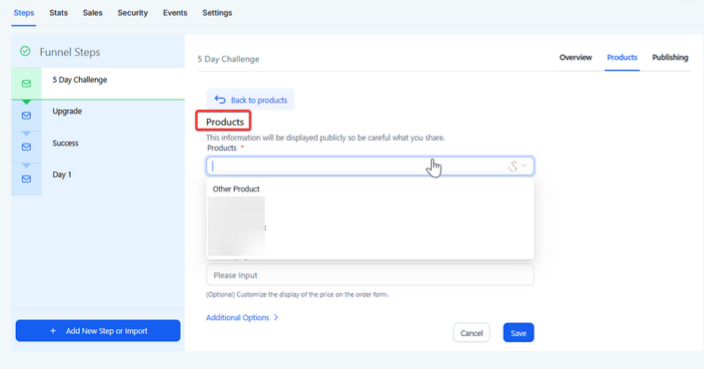 Fix: If the product is not appearing, ensure that the product is properly created and published in the Products tab before adding it to the funnel.