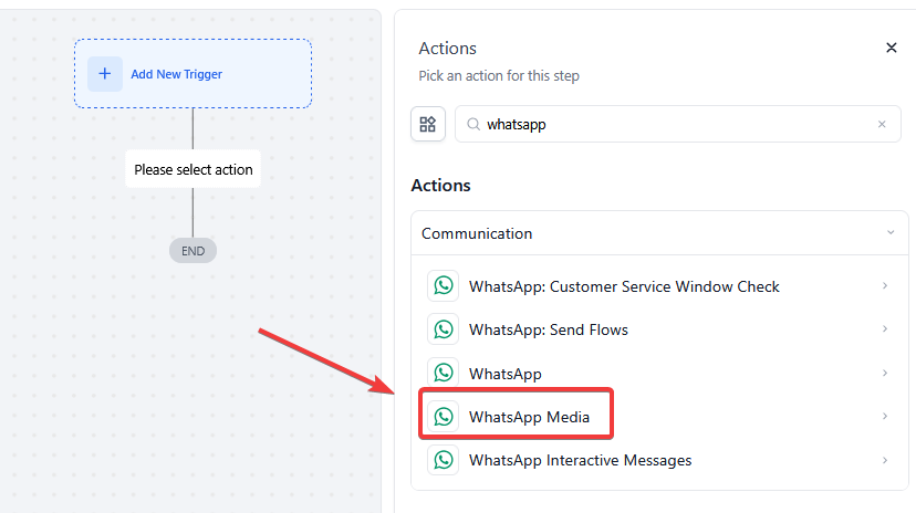 2. Search WhatsApp Media: Locate the WhatsApp Media action within the available options.