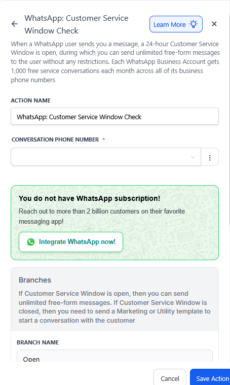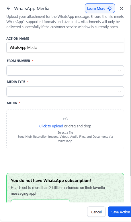 With the WhatsApp Media action, you can automate the delivery of multimedia content such as images, videos, documents, and audio directly from your workflows. This feature allows businesses to send rich media content quickly and conveniently, helping you engage customers in a more personalized and professional way.