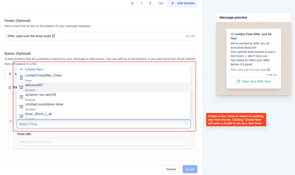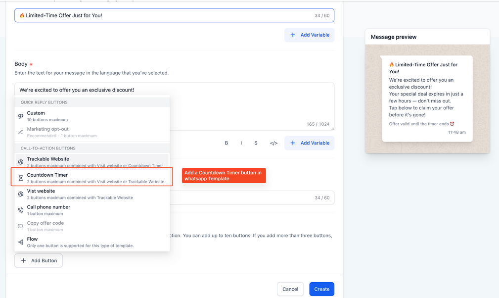 Countdown Timers allow you to add time-sensitive offers within WhatsApp messages, helping create urgency and boost engagement. This feature lets users attach fixed, recurring, or dynamic timers to buttons within message templates, so recipients experience real-time countdowns that guide them to active or expired offers.