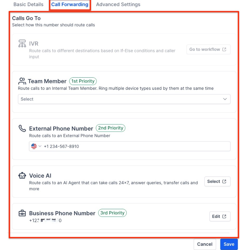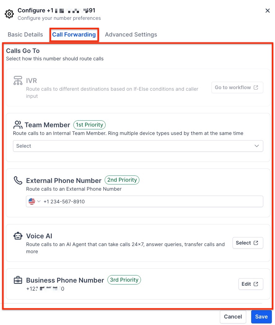 - Acquire a business phone number through Mastermind and forward calls to your main contact number. You will need to navigate to Settings > Phone Numbers. For any existing phone number, you can also edit the 3-dot button and edit the configuration.