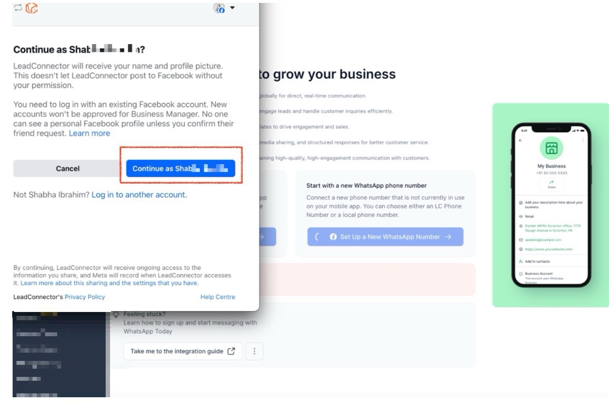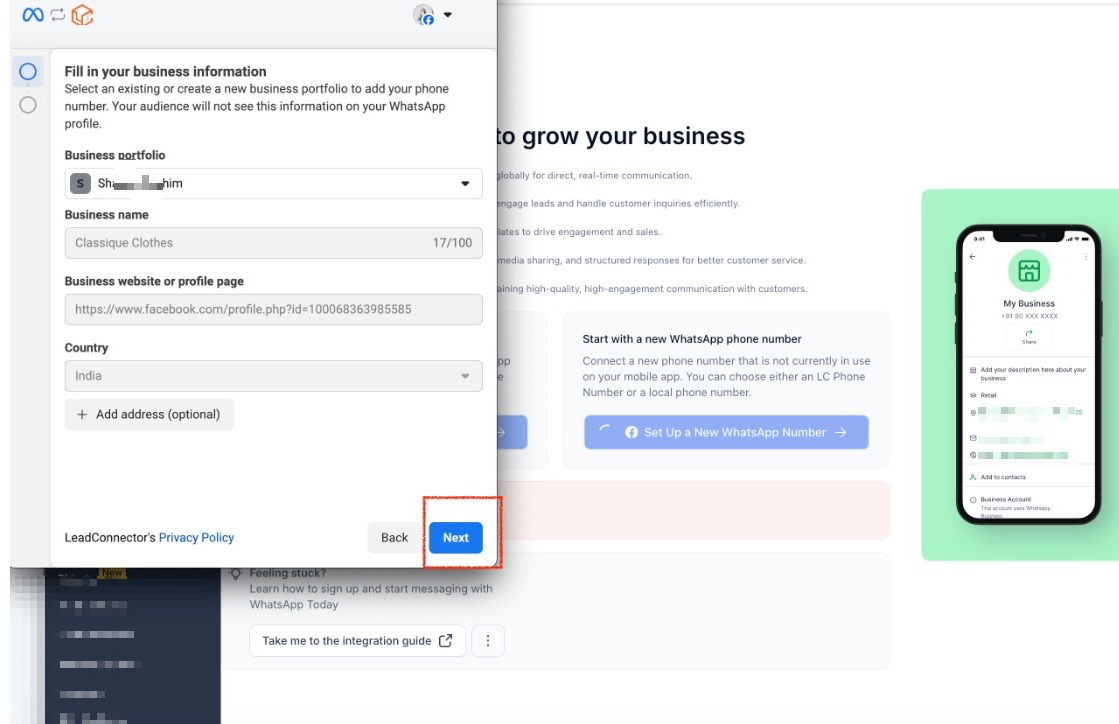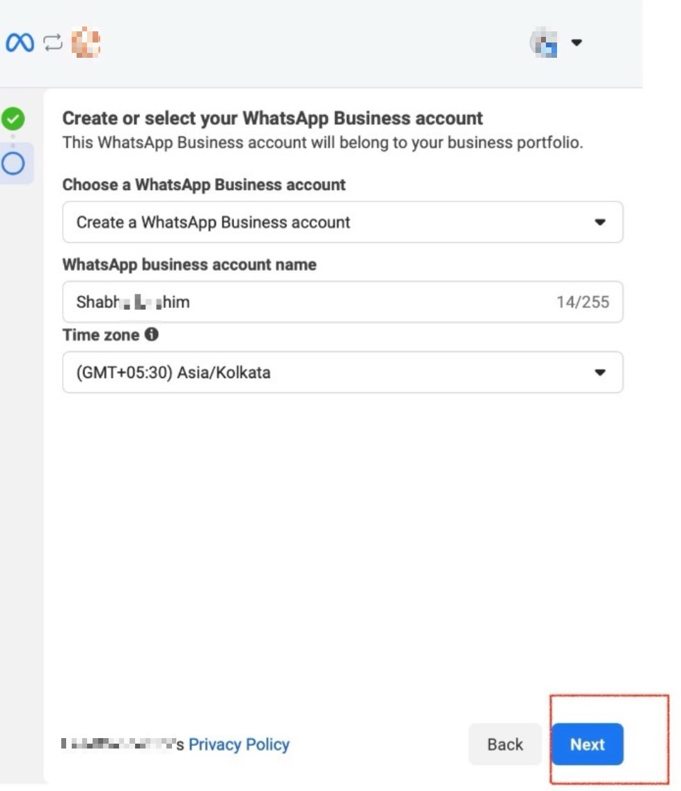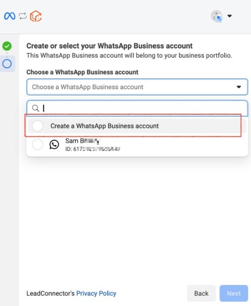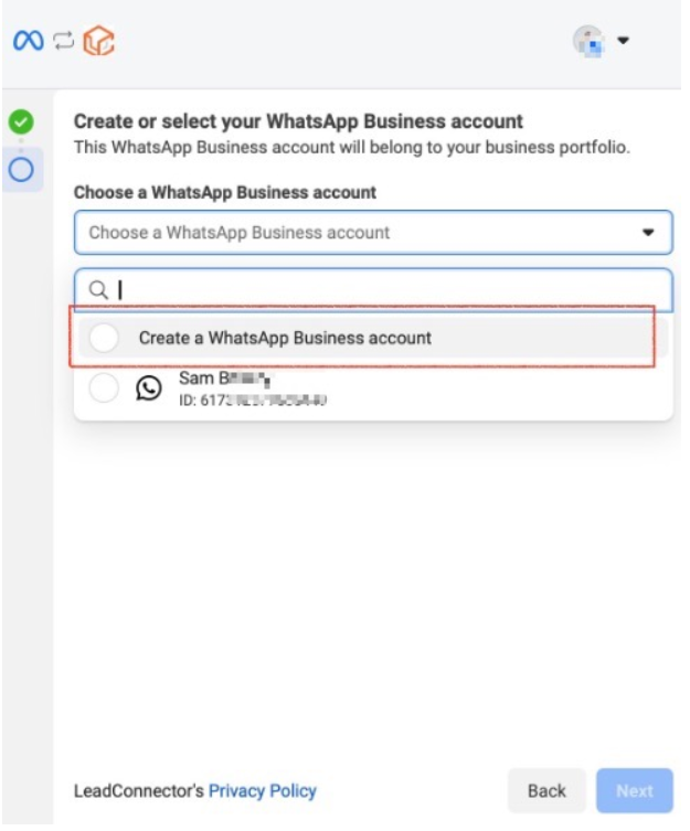 Choose Create WhatsApp Business Account, confirm your selection, and click Next