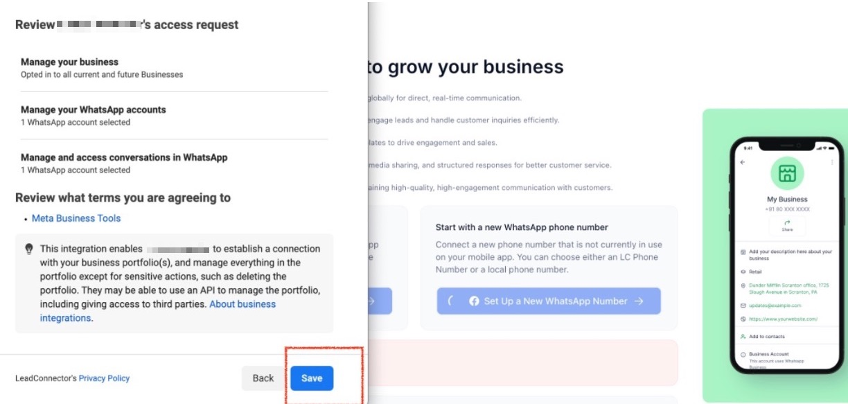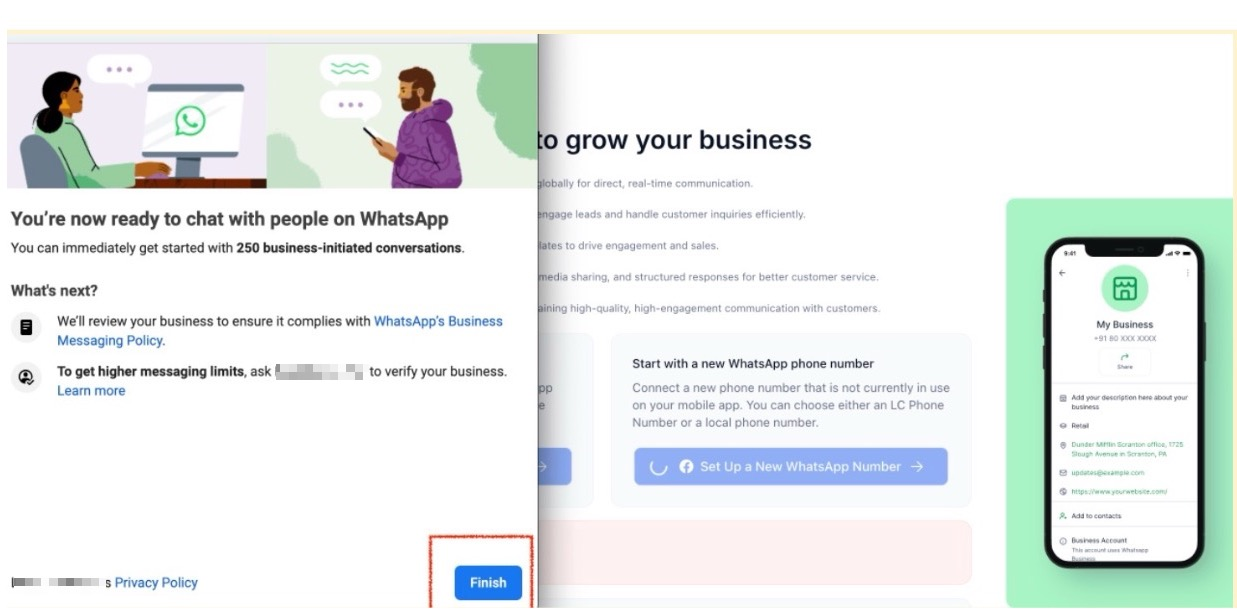 Finally, select Save and tap Finish. Your WhatsApp Business Account is now successfully integrated!