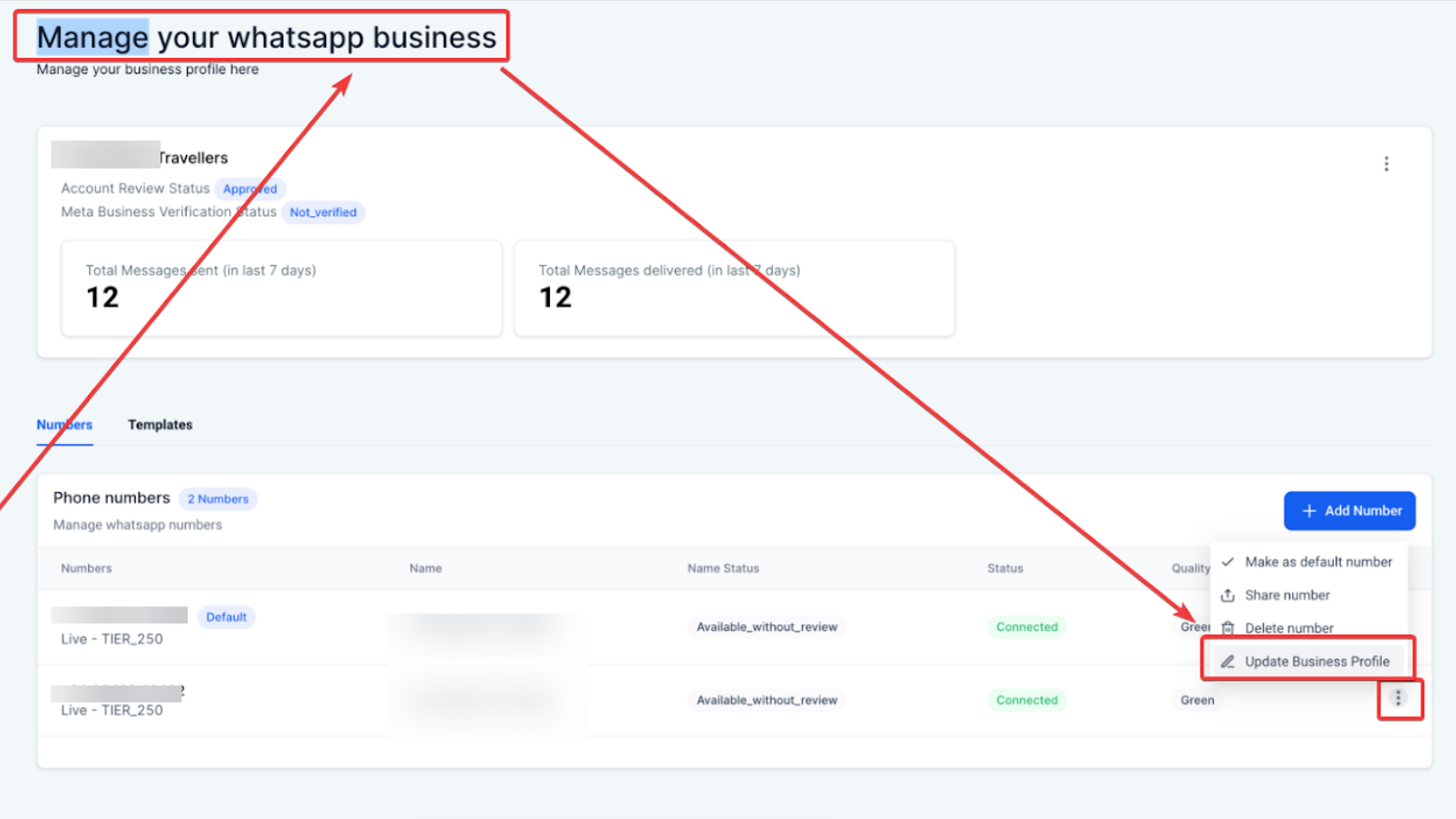 To update your business profile, go to Settings > WhatsApp > Numbers, click on the three dots under Actions, and select Update Business Profile.