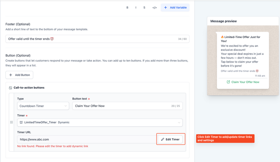 To use Countdown Timers, enable the feature within your settings, and create a WhatsApp message template.