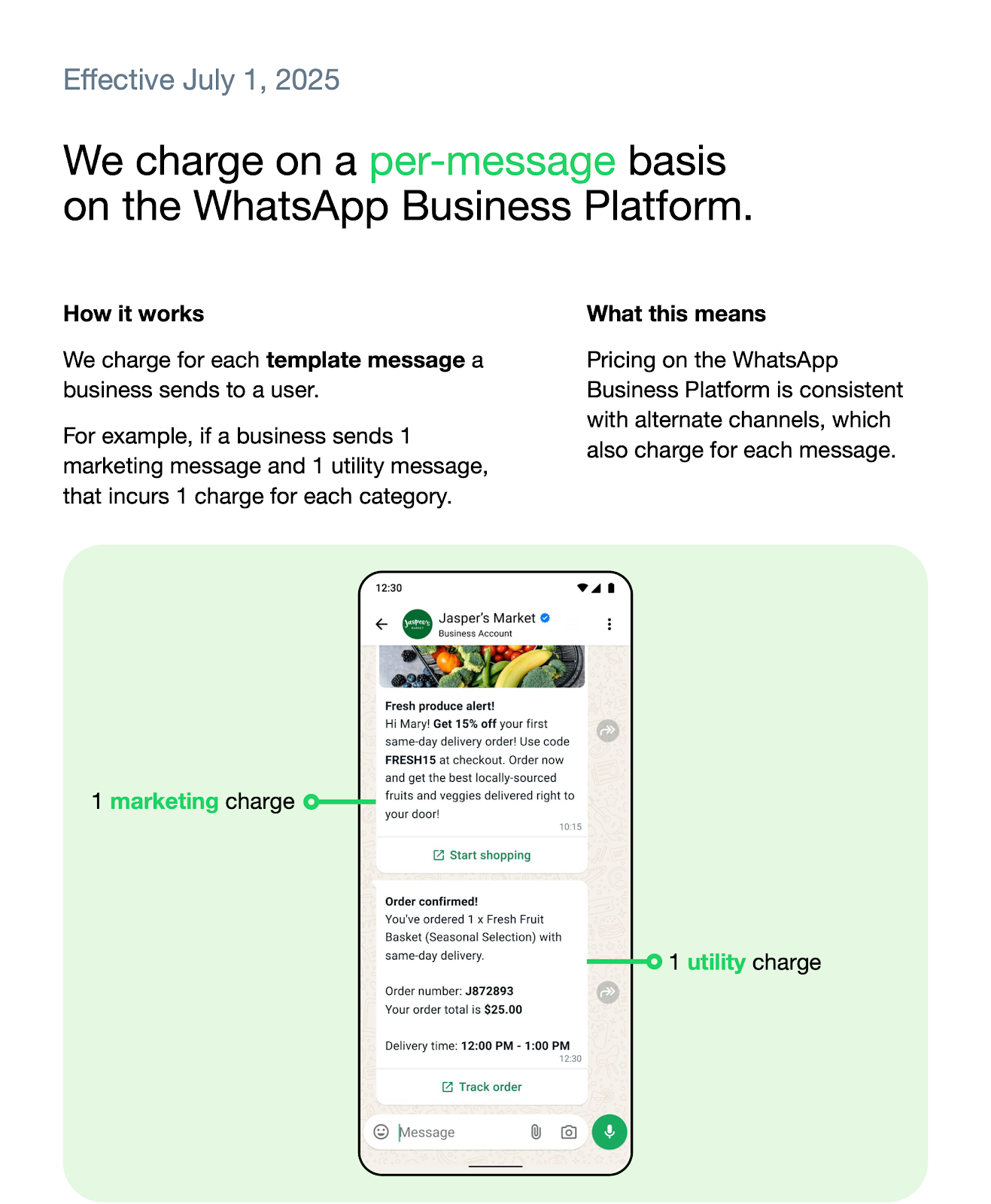We charge for each template message a business sends to a user. For example, if a business sends 1 marketing message and 1 utility message, that incurs 1 charge for each category.