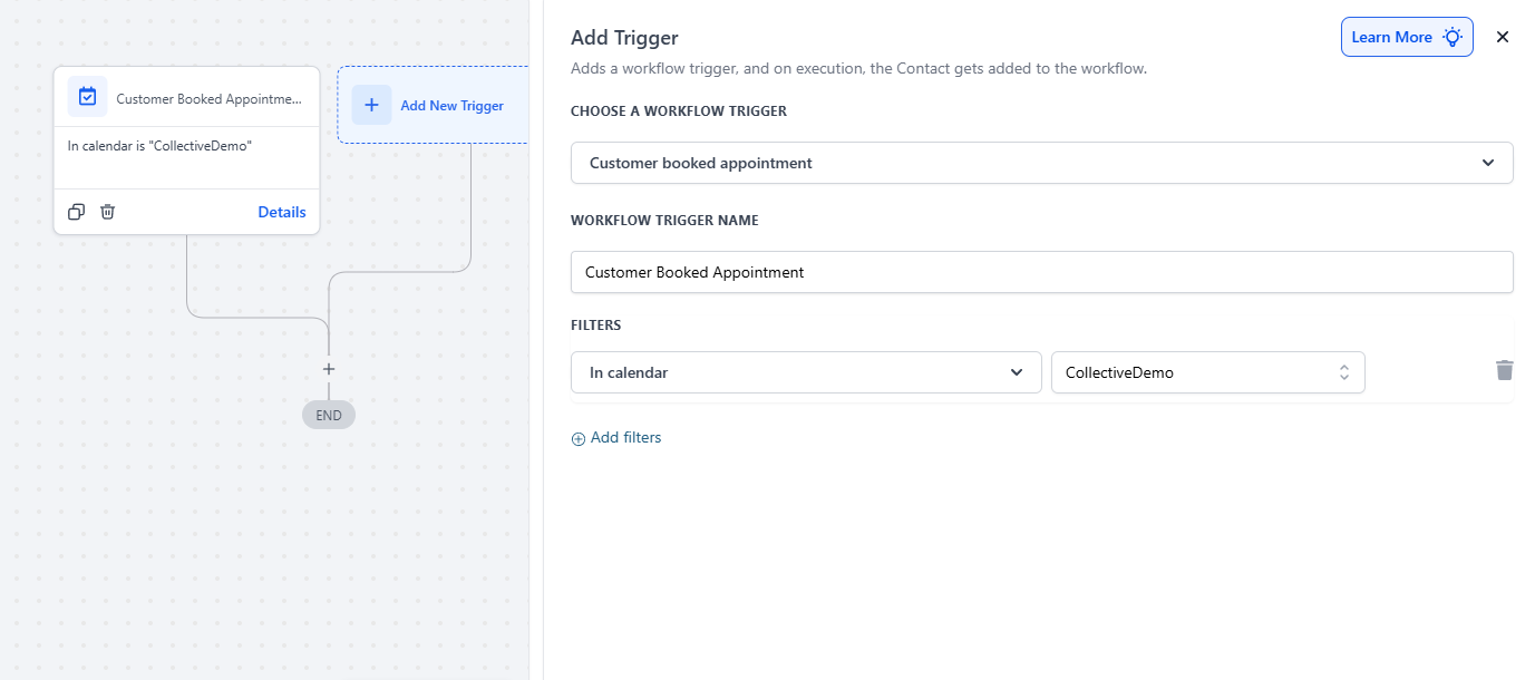 Click on “Add New Trigger” and select “Customer booked appointment.” Then, set up the filter to specify which calendar the booking should apply to. If you don’t set a filter, the workflow will apply to all calendars.