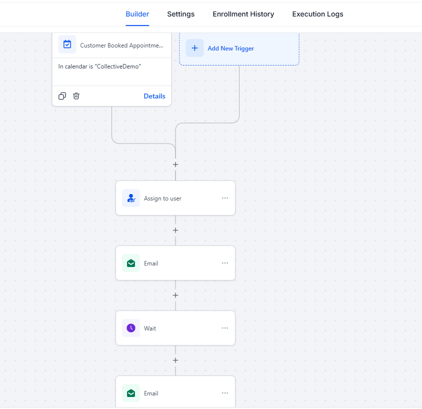 An appointment booking workflow automates a series of actions that are triggered when someone books an appointment on a specific calendar. This helps streamline your processes and ensures that necessary tasks are performed automatically.