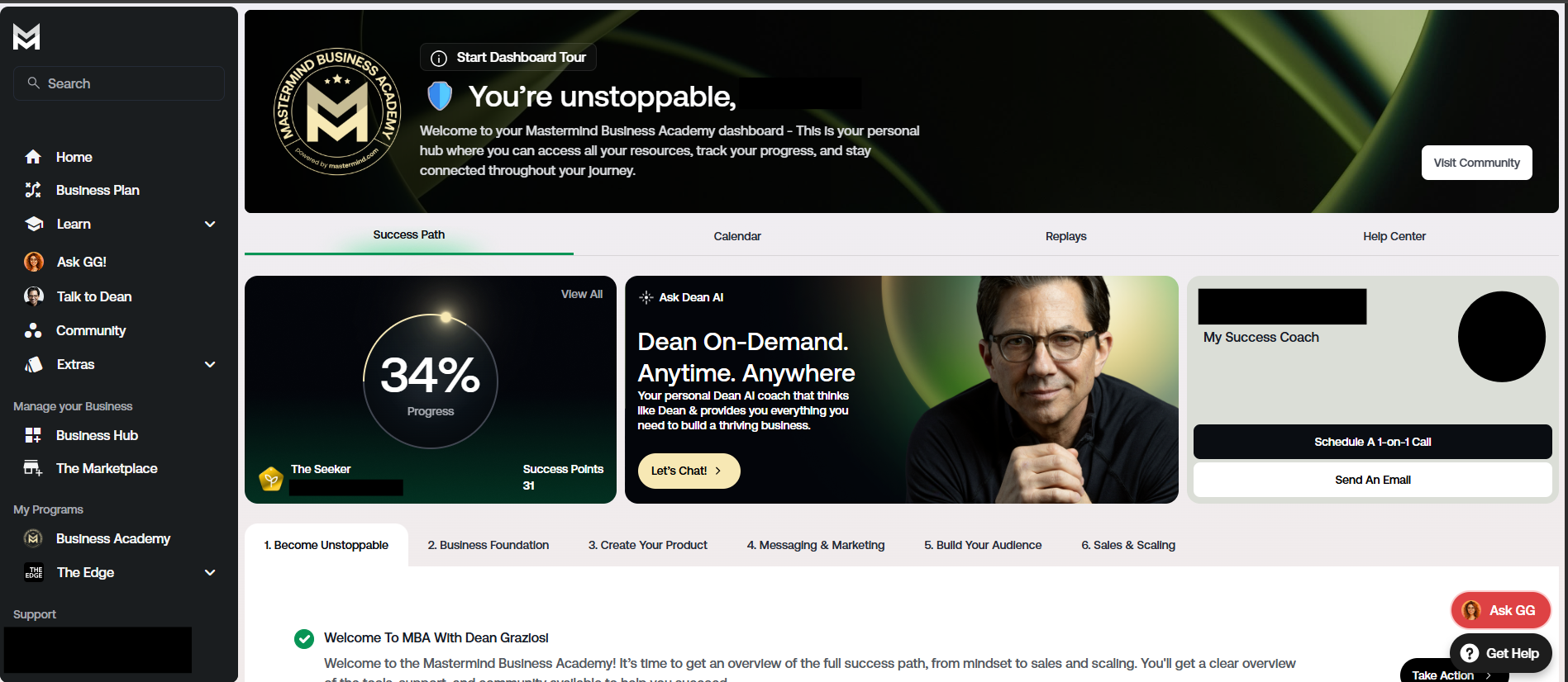 Your Business Academy Dashboard is one of your primary workspaces, designed to support your journey every step of the way. Within it, you’ll find your Success Path, MBA Calendar, Replays, direct links to support, links to the MBA Community, access to your Success Coach, and much more.