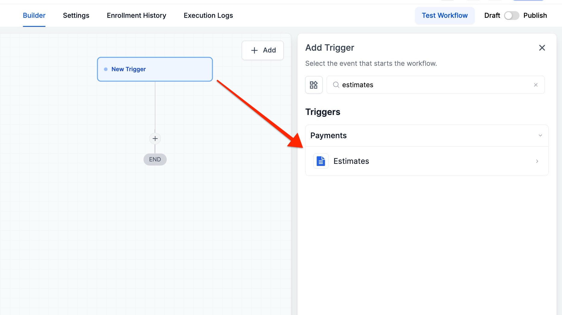 - Choose the "Estimates" trigger from the list of available triggers. This trigger allows you to automate actions based on specific estimate events.