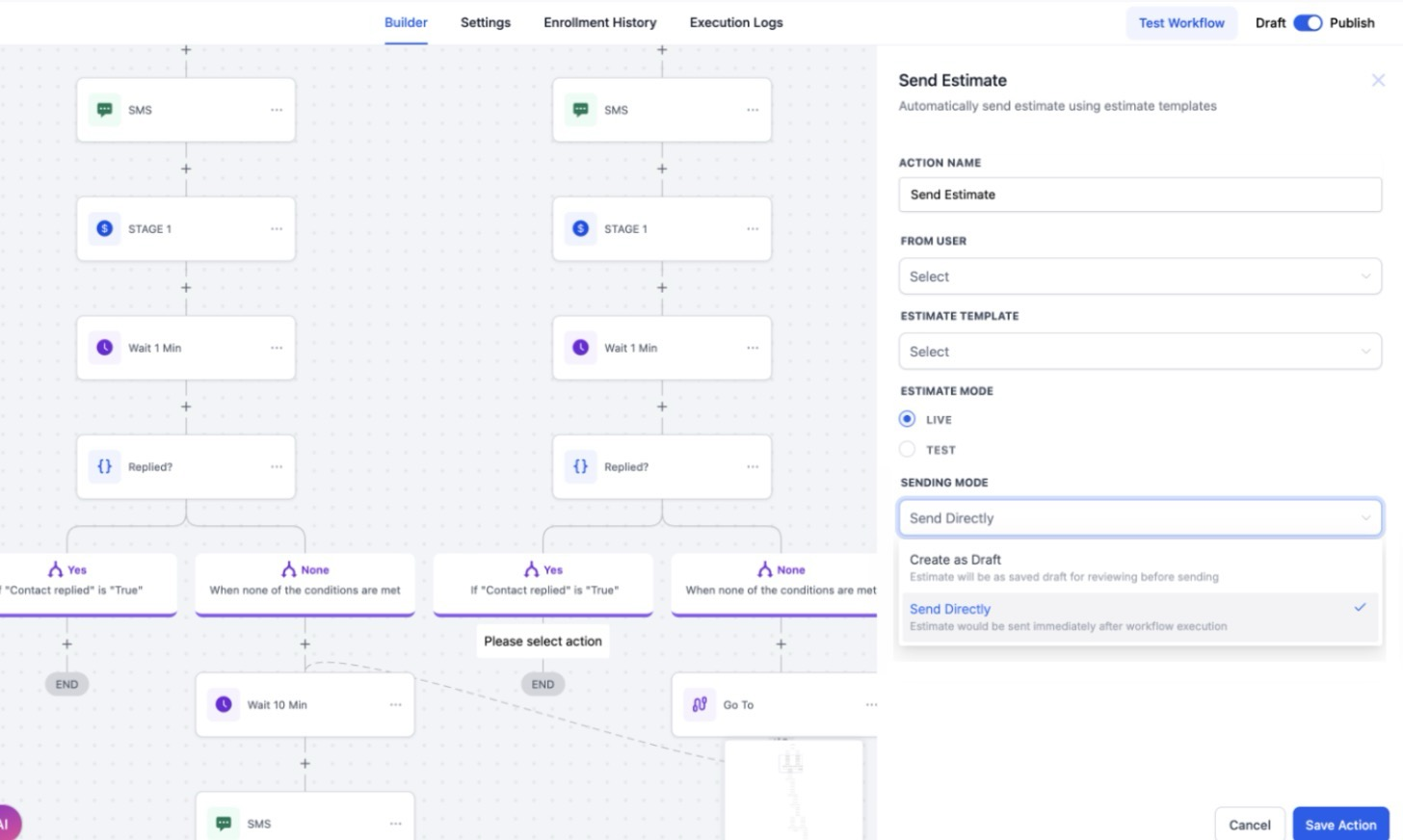 - Select an option from the "Sending Mode" dropdown, either "Send Directly" or "Create in Draft." With the “Create in Draft” option, each time this workflow is triggered, a draft estimate will be created and placed in the draft section of Estimates.