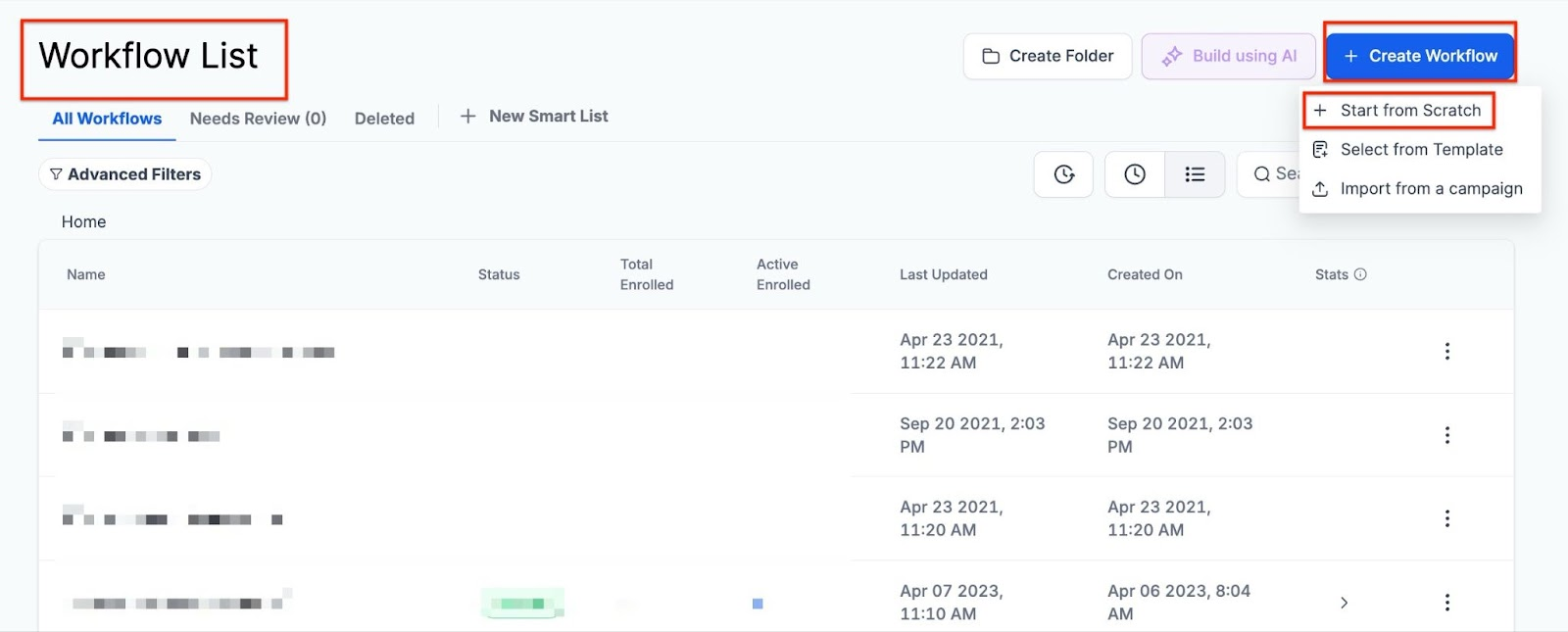 - Navigate to Tools & Reporting > Automations > click + Create Workflow, and click Start from Scratch