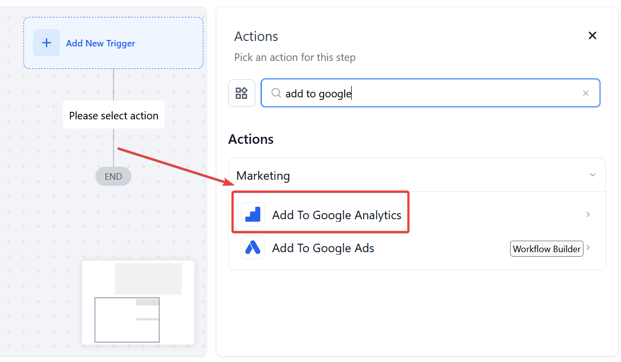 - Under Actions, select Add to Google Analytics in the Marketing section of the Actions Menu or use the search feature. Upon selection, the Action setup menu will appear