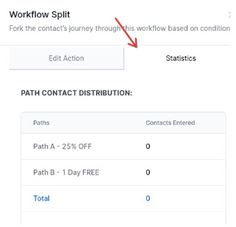 - To know how the stats are going and which contacts are going into which path, click on the action "Split", and on the Statistics button.