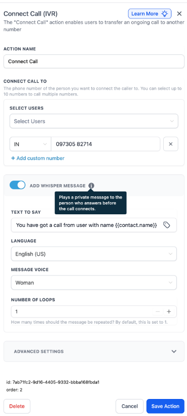 - Custom Music: Users have the option to upload a voice message, branded music, or any other audio format to be played before ending the call, along with specifying the number of loops.