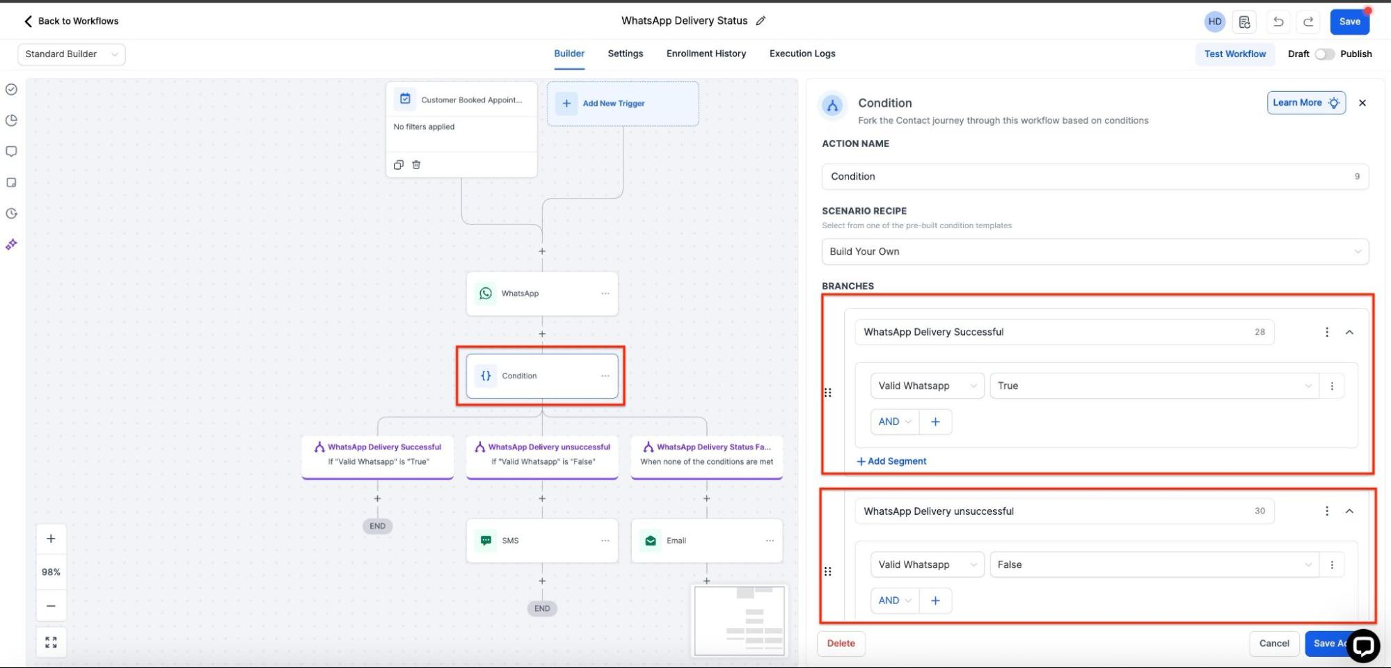 - WhatsApp message templates must be created before sending a message in a workflow and setting up conditions based on the delivery status.