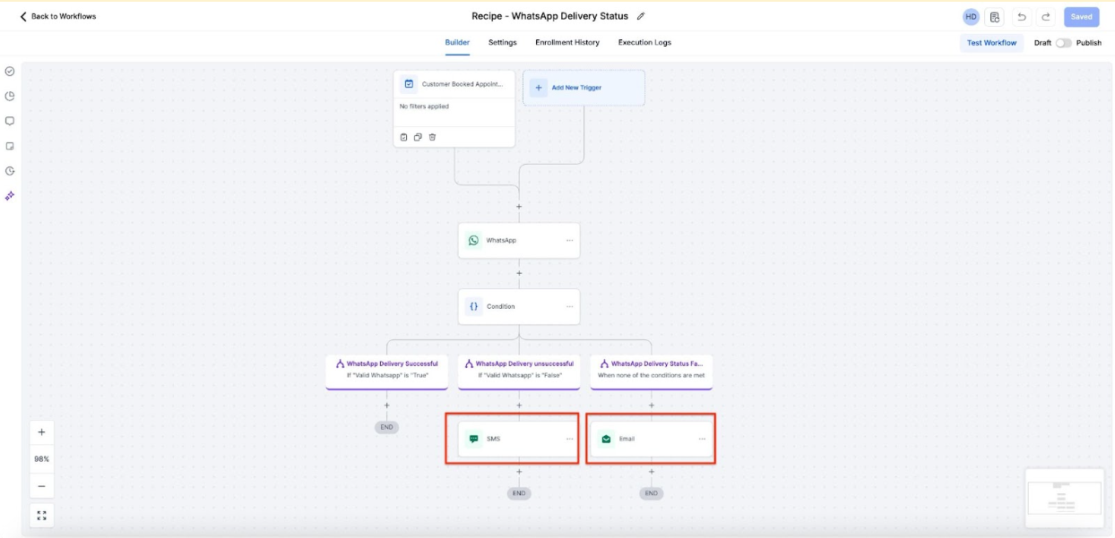 A7: Yes, you can configure the workflow to send an alternative message via SMS and notify your team if the WhatsApp message fails or is not delivered.