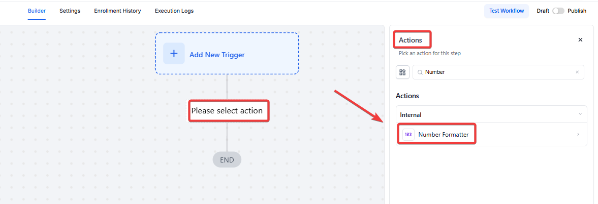 In the Number Formatter action, choose the Format Number option in the Action Type dropdown.