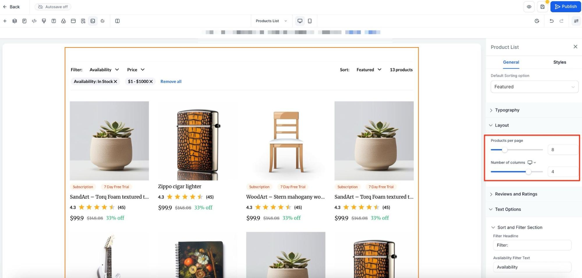 - Access the Store Builder, select the Product List element, and navigate to Layout Options under General Settings.