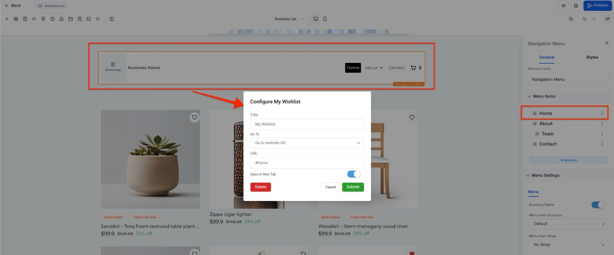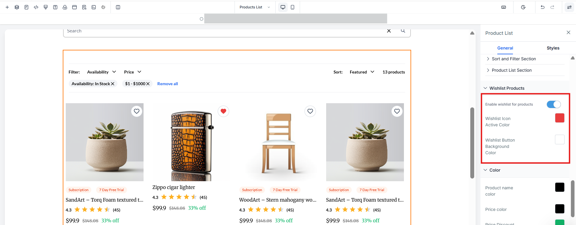 - To enable the wishlist button, within the store builder select the Product List, Product Details, or Featured Product Element.