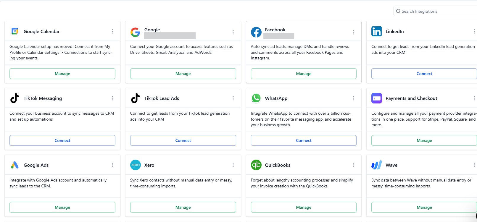 - Disconnect and reconnect the integration, ensuring the LeadConnector integration is also removed on Facebook’s side under Facebook Profile > Settings & Privacy > Settings > Search for "business integrations".