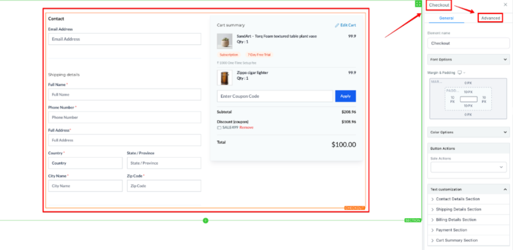 2- Select the Checkout Element: Click on the Checkout element and go to the Advanced Section in Settings.
