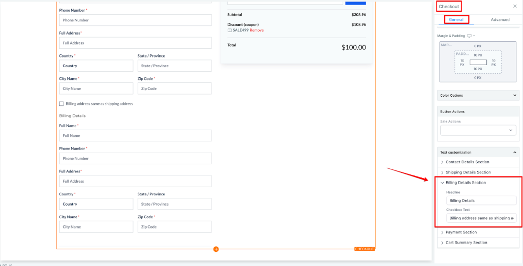 - Text Customization: Customize the billing address headline text, checkbox text, and field labels, including Full Name, Phone Number, Address, Country, State, City, and Zip Code.
