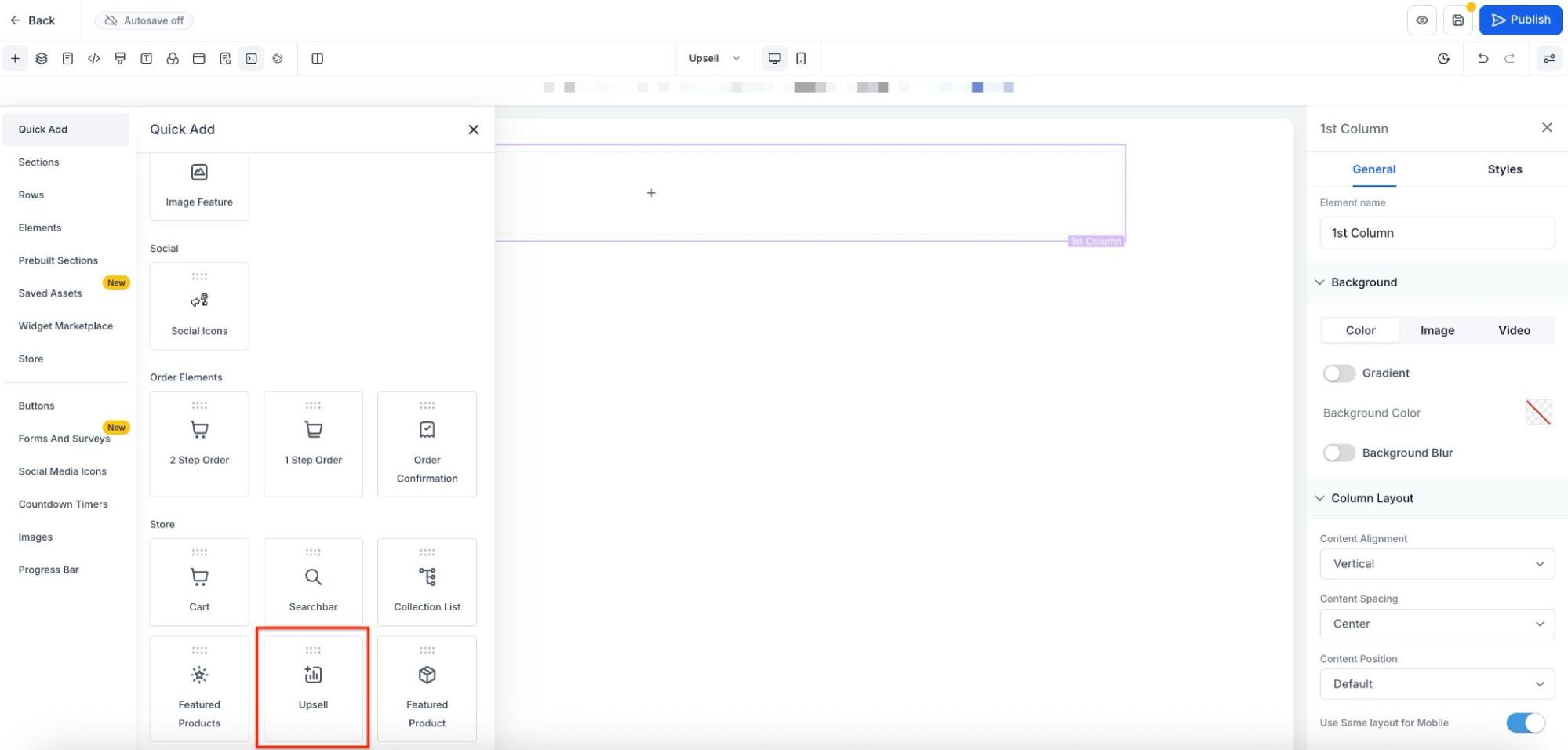 - Select Add Element, then drag and drop the Upsell Element into your row.