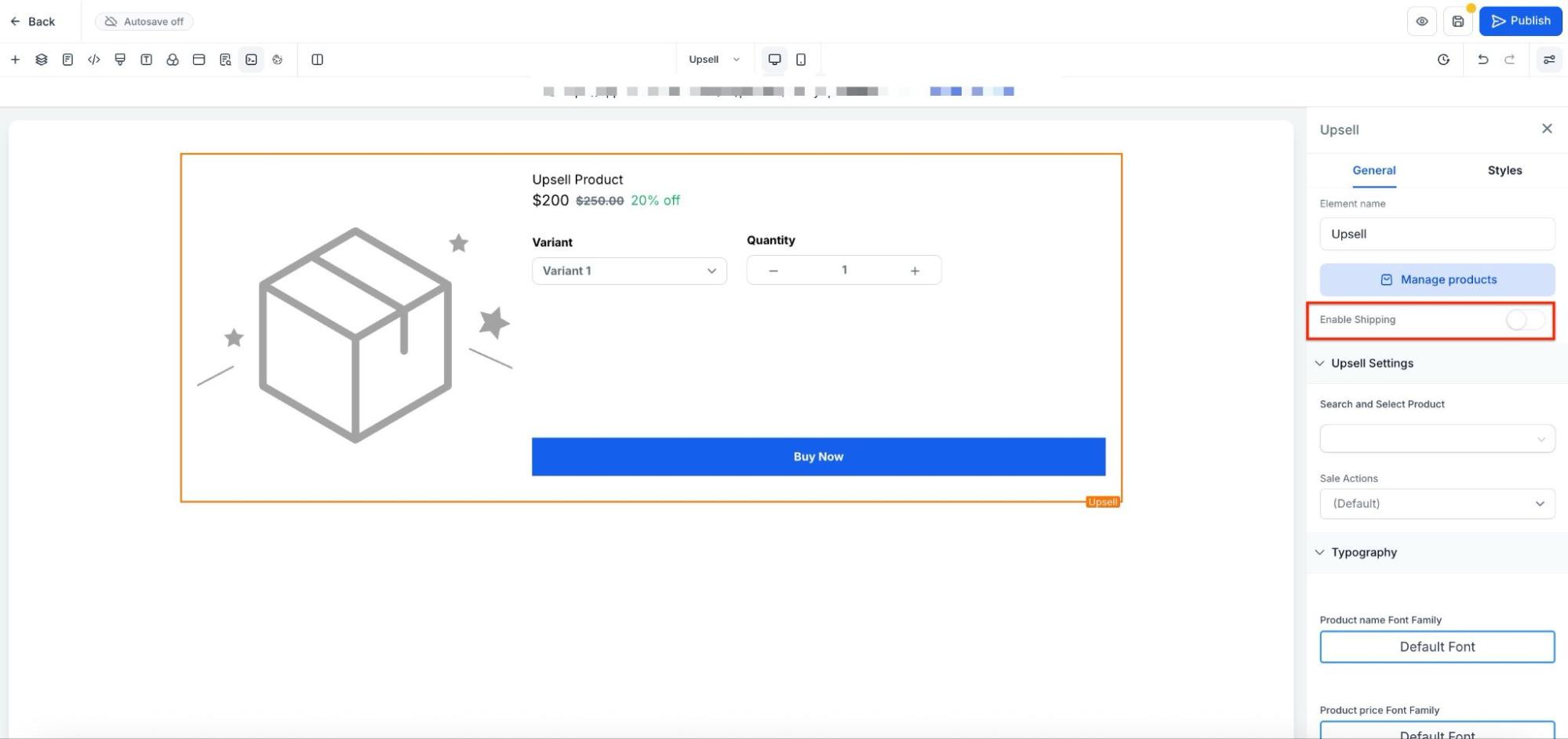 - Store owners can enable or disable the shipping charges for each Upsell element by enabling/ disabling the toggle in the builder preview.