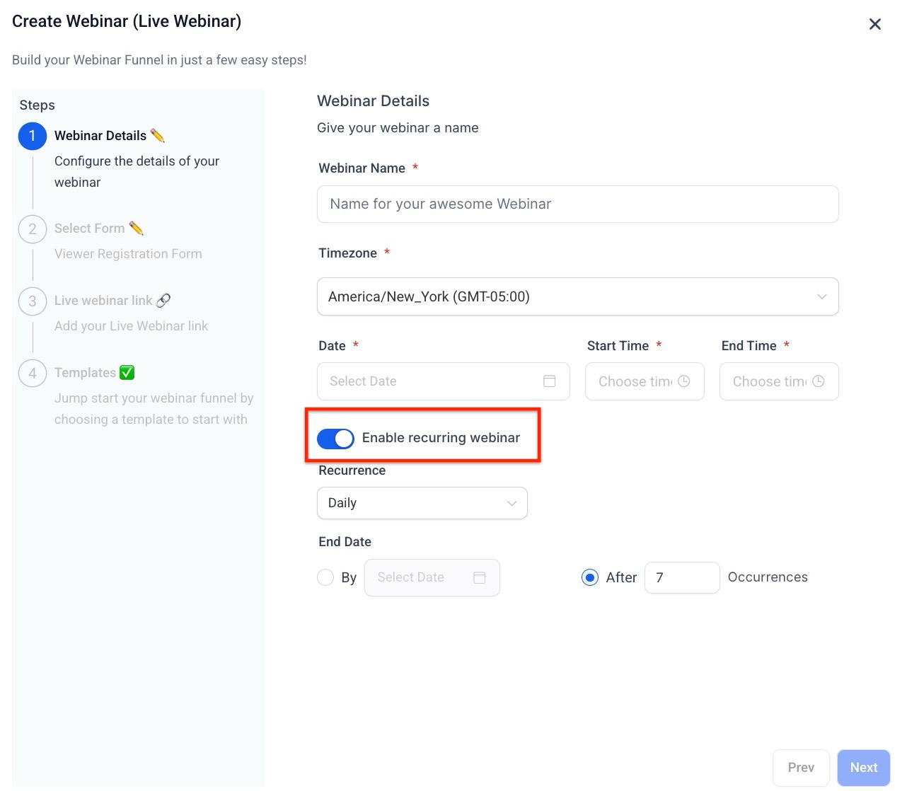 - Recurring Webinar Settings: Easily schedule and manage recurring webinars with flexible frequency options to save time and enhance audience engagement.
