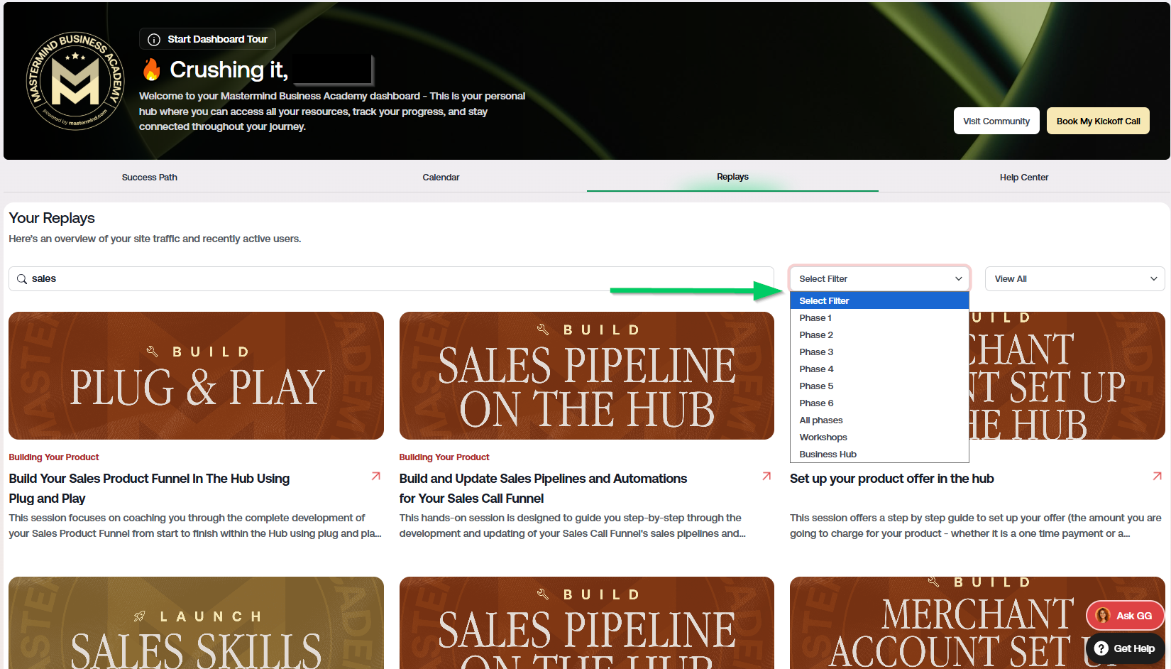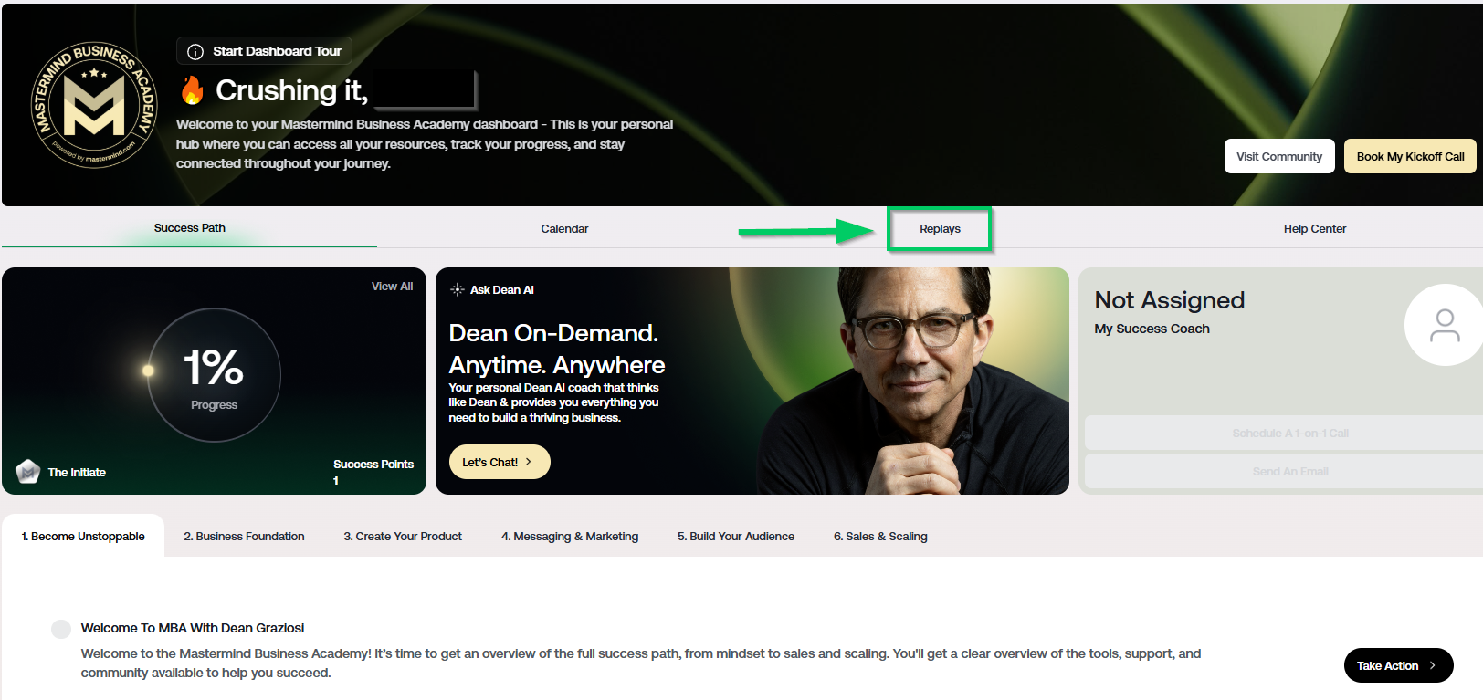 All live session replays are now conveniently stored in your Business Academy Dashboard, allowing you to watch at your own pace. Follow the steps below to quickly locate and access the replays so you can revisit key lessons whenever you need.