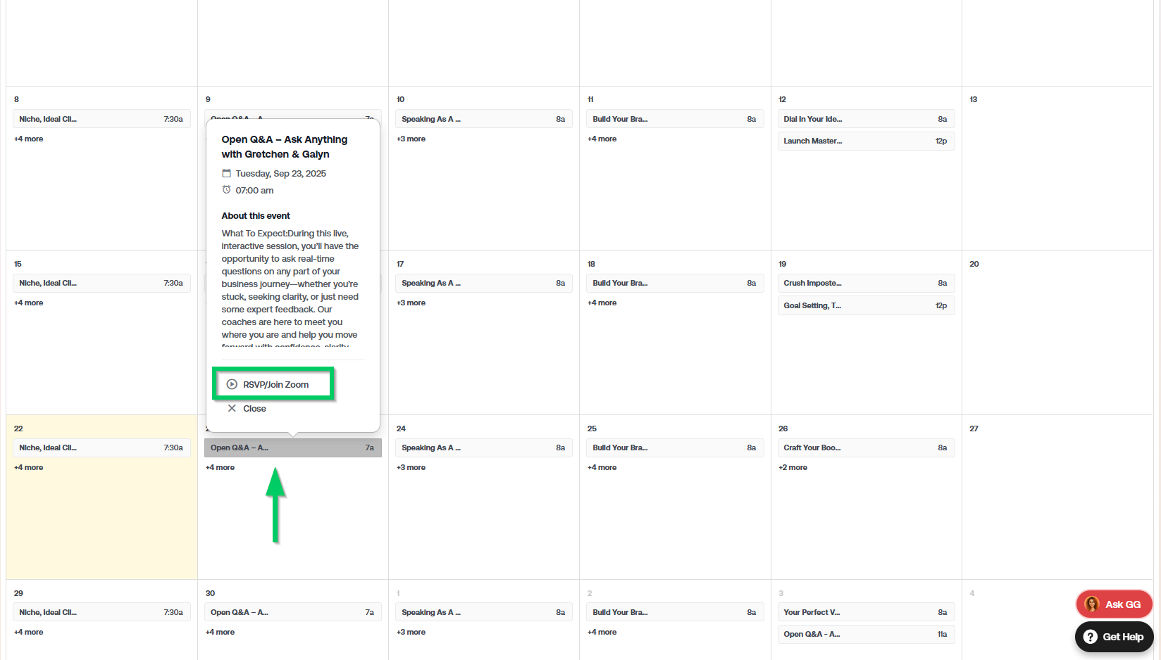 Note: At this time, you cannot join an active live session past the start time from the Business Academy Calendar directly. However, you can join via the RSVP email you received with the provided Zoom link!