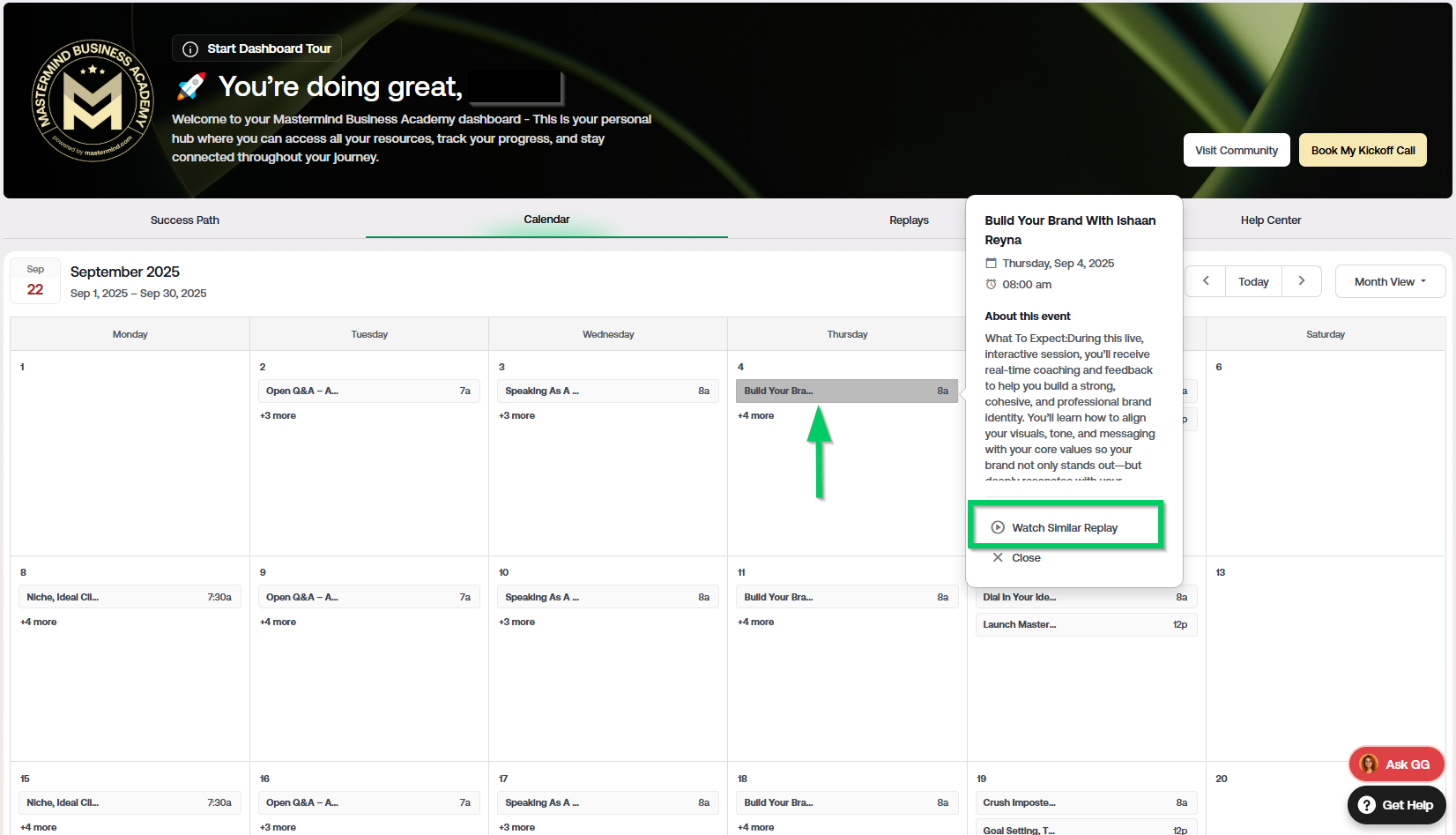 Note: You can also refer to the following article for more information on accessing past replays from the Replays tab: How to Locate The Live Training Replays for Mastermind Business Academy