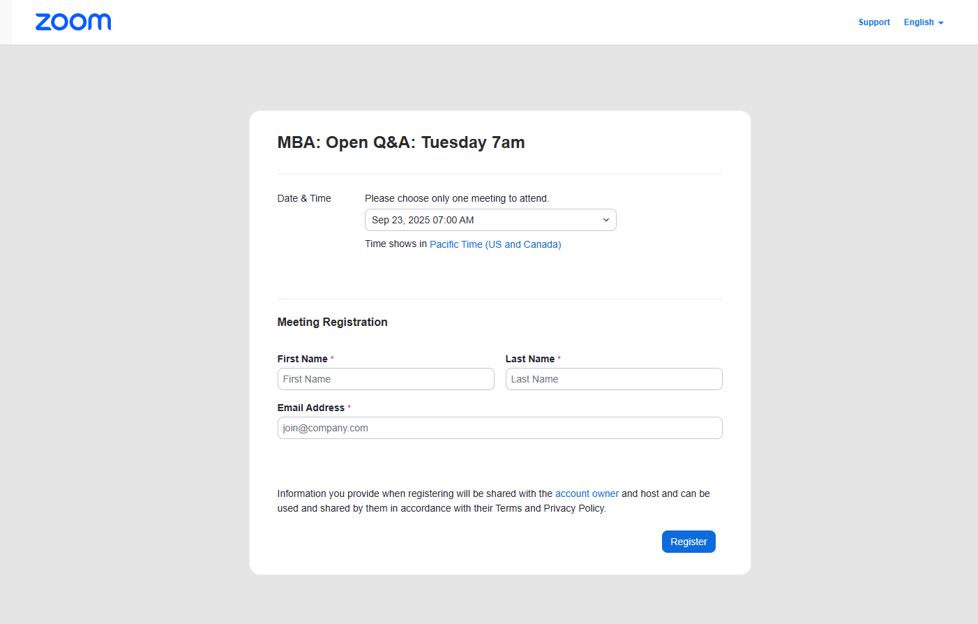You will then need to complete your Meeting Registration via Zoom, where our trainings are held. Be sure to fill out all the required fields: